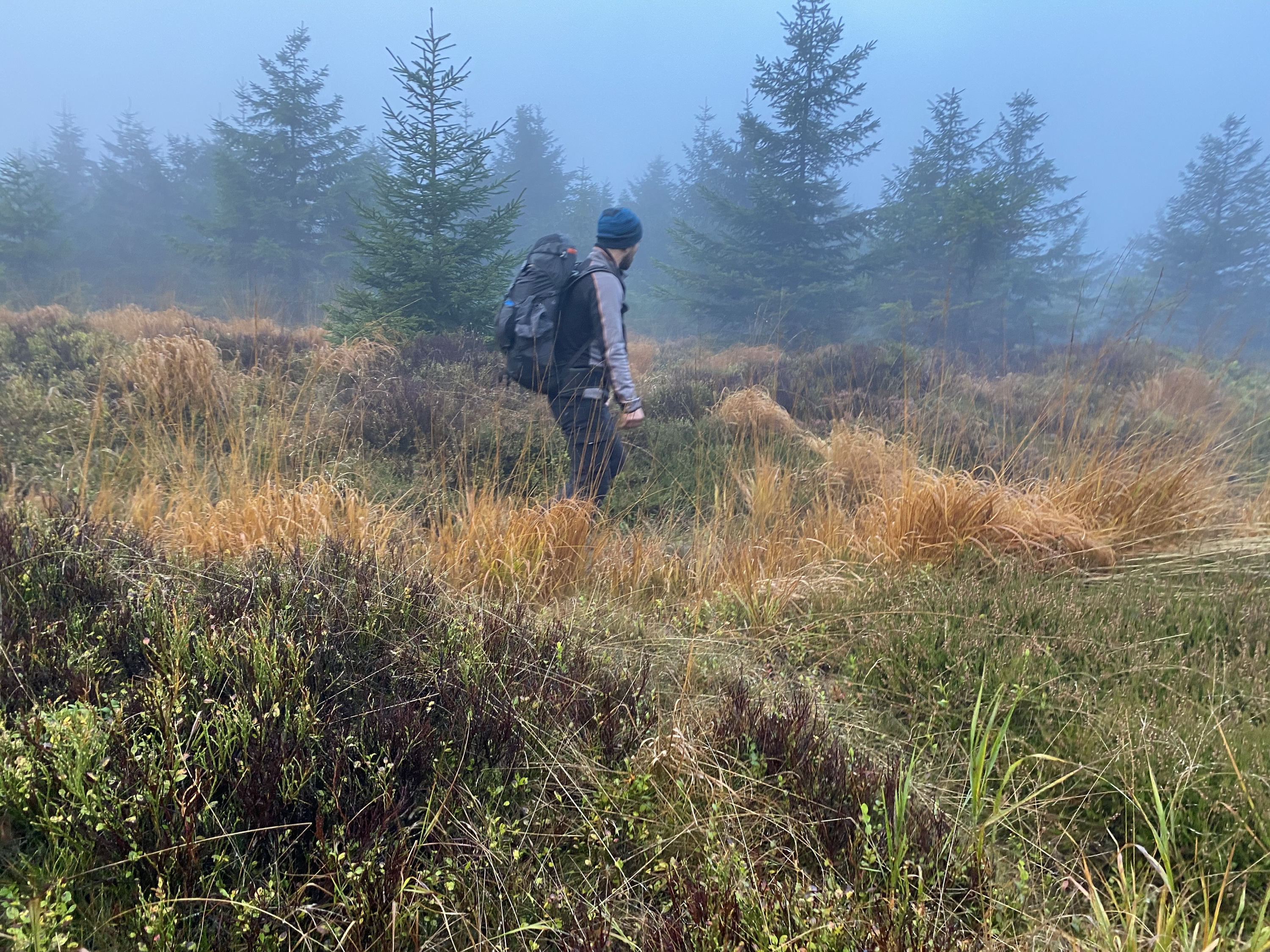 Vlhká etapa dešti nasáklou krajinou (Bóčo díky za geniální zkratku mokrou loukou :D), převážně po tzv. hřebenovce – Jiráskově cestě. Hloubání v potemnělém mlžném oparu má určitě svou mystiku.