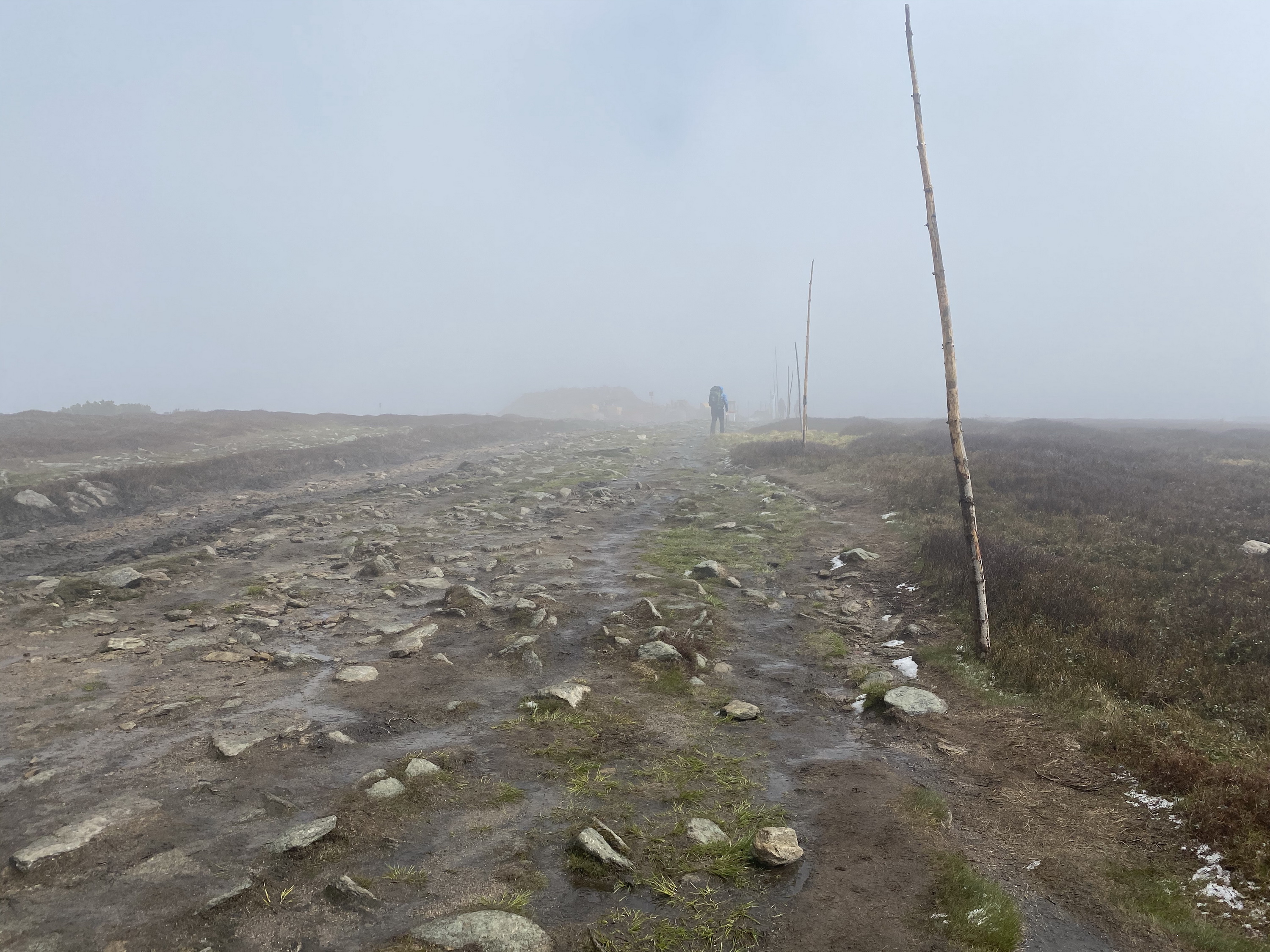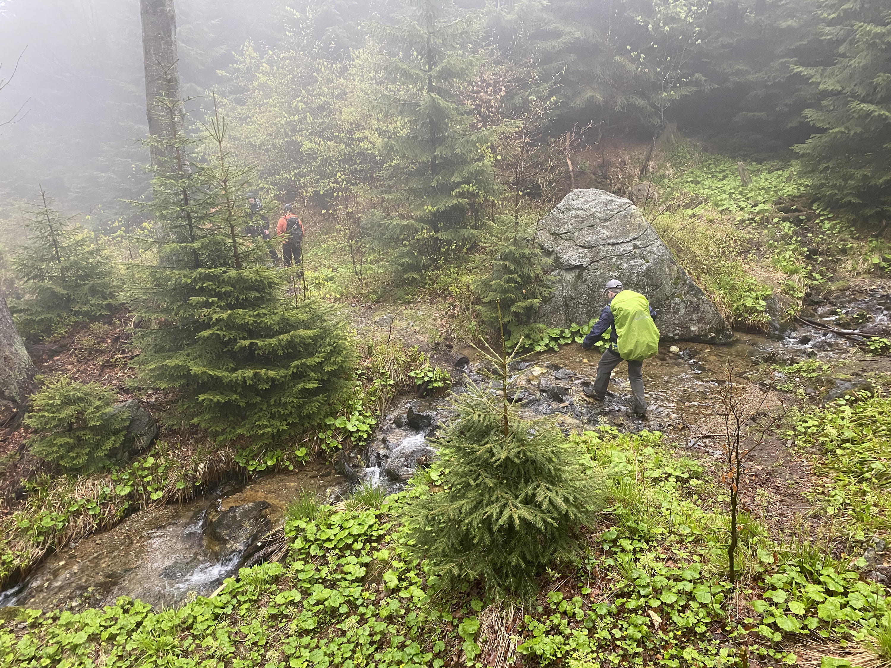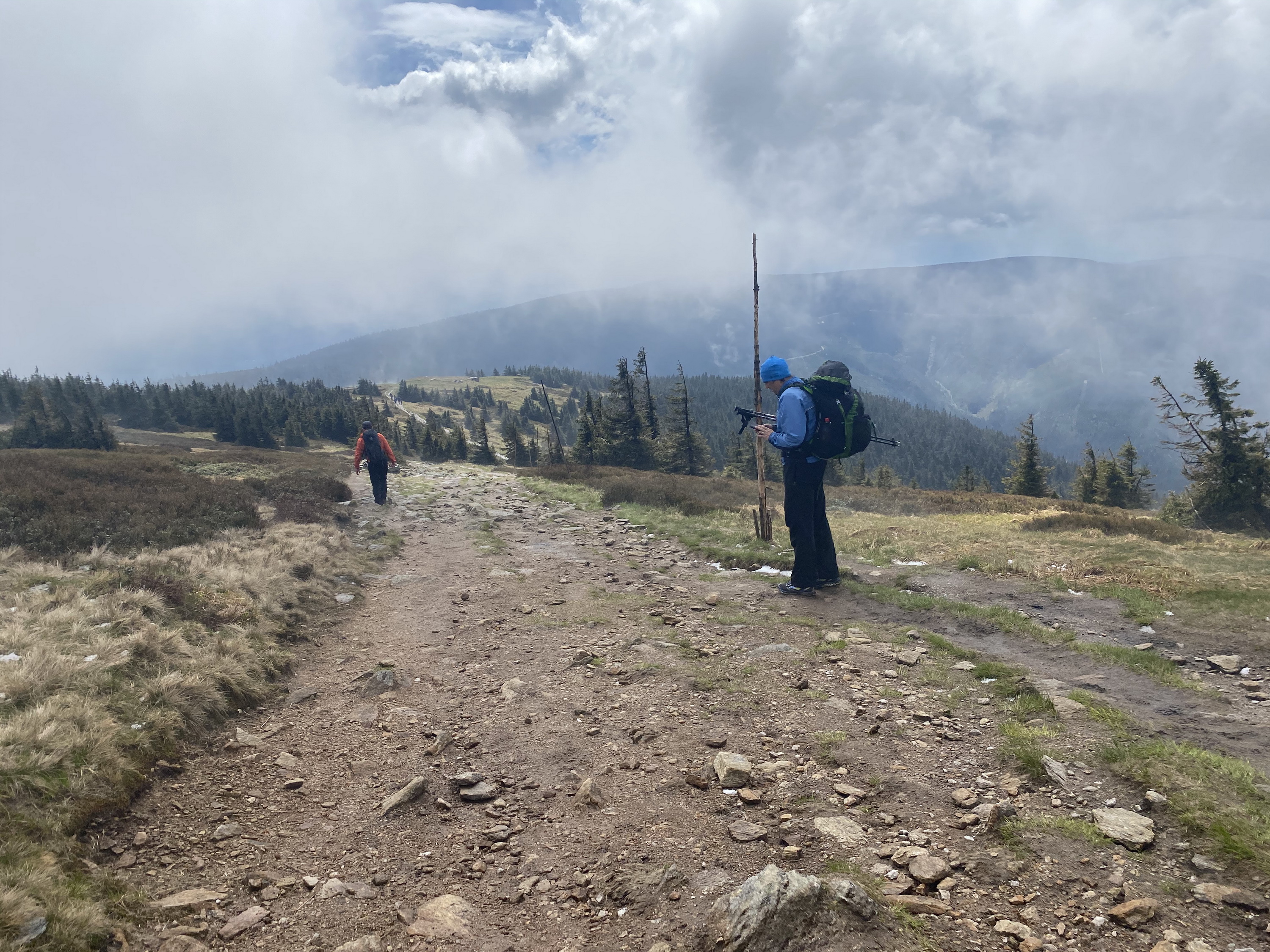 Po velkém čachrování s termínem jsme vyrazili na přelomu května/června, očekávajíce plahočení s jazykem na vestě, do půl těla, možná na boso? Co ale jiného čekat na Králickém Sněžníku, než sníh.. Po ranním probrození provlhlé louky tedy nastoupáváme poctivé a táhlé výškové metry a když se přiblížíme na dostah Malého Sněžníku, strhává se sněhová bouře, která polevuje až prakticky po sestupu ze Sněžníku Králického. Kolem pramene Moravy téměř prolétáváme, stihneme jen ochutnat lahodný pramen a raději mizíme, tradiční polská hlasitá rozšafnost nám k srdci stále nepřirostla. Vzpomínáme, když jsme procházeli kolem jejího soutoku s Dyjí, tam kde opouští ČR v jihovýchodním cípu. Tam jsme tedy raději neochutnávali..