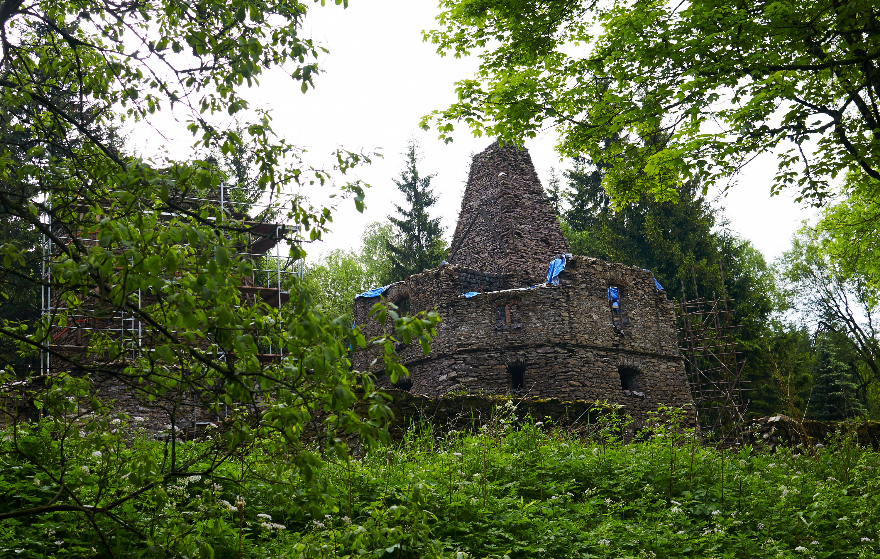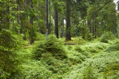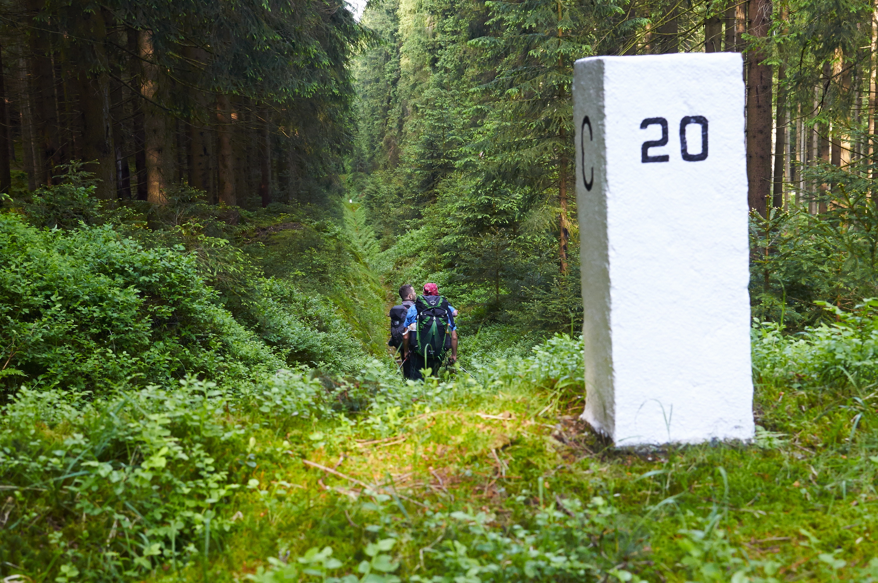 Velmi intenzivní etapa. Kamila necháváme v základním táboře s ženami a dětmi, stejně již tuto část šel. Těsně před startem narychlo měníme směr, vzhledem k příznivější předpovědi, i tak jedeme 3 hodiny blesky, epicentrem bouřky (spíš bouře) až na start. Noční pochod pouze za město, přesto nám Bóča neodpustí „vykoupání“ bot ve vysoké mokré trávě před spaním. Stavíme tarpy, usínáme za bubnování ustupujícího deště. Další den nastoupáváme až na Klínovec, a dál se nám to zdá zbývající čas již stále z kopce. Procházíme krásné louky, v zimě sjezdovky. Propleteme se Holubími skalami, přebrodíme na pěkném místě Komáří potok a již nás vítá útulna ve formě přístřešku, přímo na hranici (Medvědí jámy). Ta bude do zítra naším domovem. Ráno nechtěně „dvojitá snídaně“ (sypu kaši sypu, až je jí celý hrnec..) a nakonec se ukáže, že to bylo to nejlepší, co jsem mohl udělat. Boty krásně oschlé vydrží přesně pět minut, cestička je sotva znatelná, když se prodíráme vysokým borůvčím, v ostře zařízlé několikakilometrové hraniční rýze. Pohádka. Každopádně již víme, proč tudy mapy.cz neroutují jako po „normální cestě“. Fotíme se u výjimečného hraničního kamene, tentokrát z roku 1672! Další velký zážitek. Stejně jako tržnice v Potůčkách. Jak trefně pronesl jeden z místních pinglů, „je to tu jako jedno velký panoptikum“. Pokračujeme dále, po cestách co nejblíže hranice.