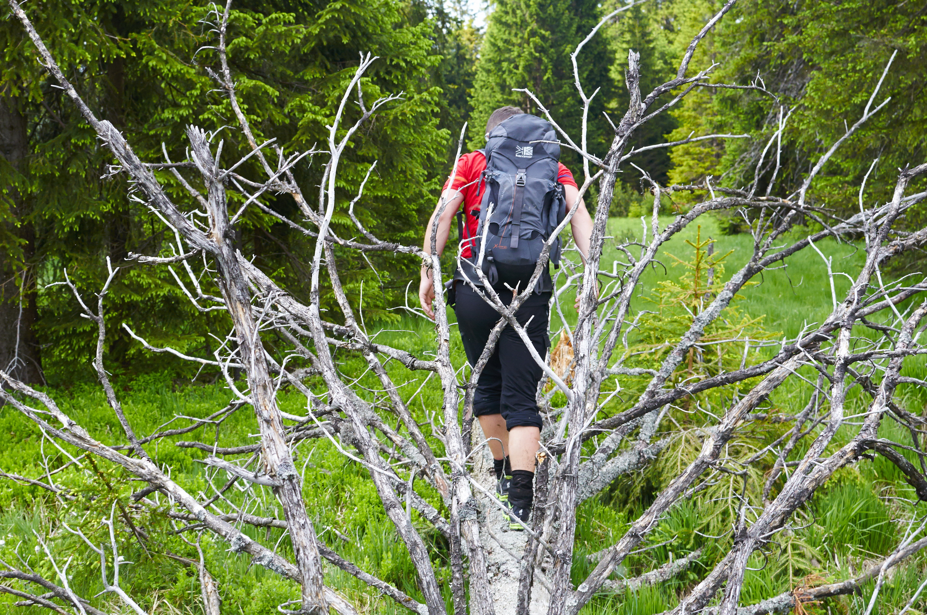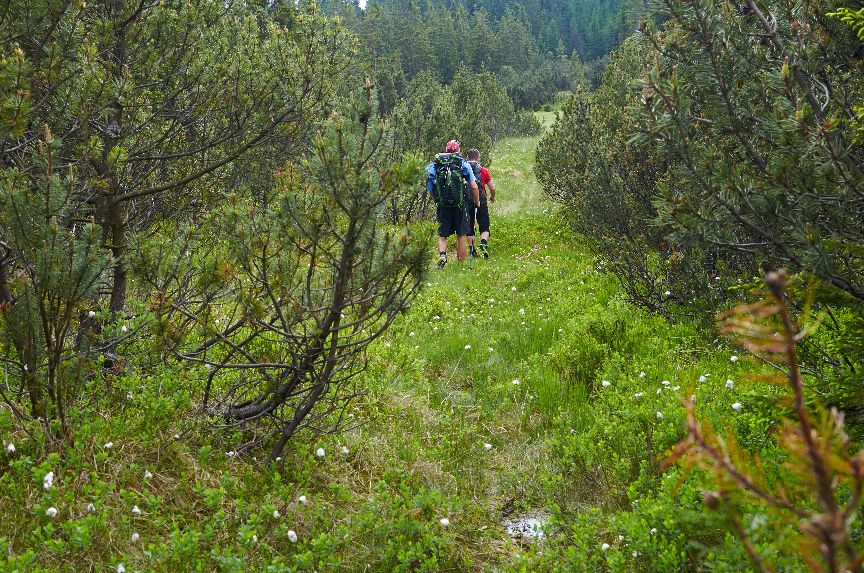 „Zážitek nemusí být pozitivní, hlavně když je intenzivní..“ napadá mne, ale radši to říkám jen potichu, aby to Džarda přes pidlikání neslyšel 😉 Co my si pro něho připravíme na příště.. Ještě nás měla čekat jedna vlhčí oblast. Dle mapy již jsme za ní, ale to by bylo moc jednoduché, situace se tedy záhy opakuje a schůdnou cestu hledáme ještě podstatně déle. Vrátit se je až ta poslední možnost. Pro jistotou ale jdeme s rozeplými přezkami od batohů a s Džardou probíráme, jak v krizi (na způsob hlubokého sněhu) získat oporu a rozložit při zapadnutí váhu hůlkami do kříže. Vpředu máme ale zdatného stopaře Bóču ve svém živlu, který nás vyvádí z krvelačných mokřadů a získává si tím bez debat titul Král Krušavy. Děkujeme.